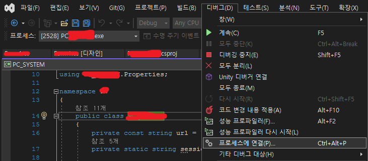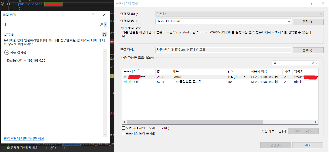 - VS 상단 디버그 > 프로세스에 연결 > 연결 대상 > 찾기 > [PC 이름] 선택