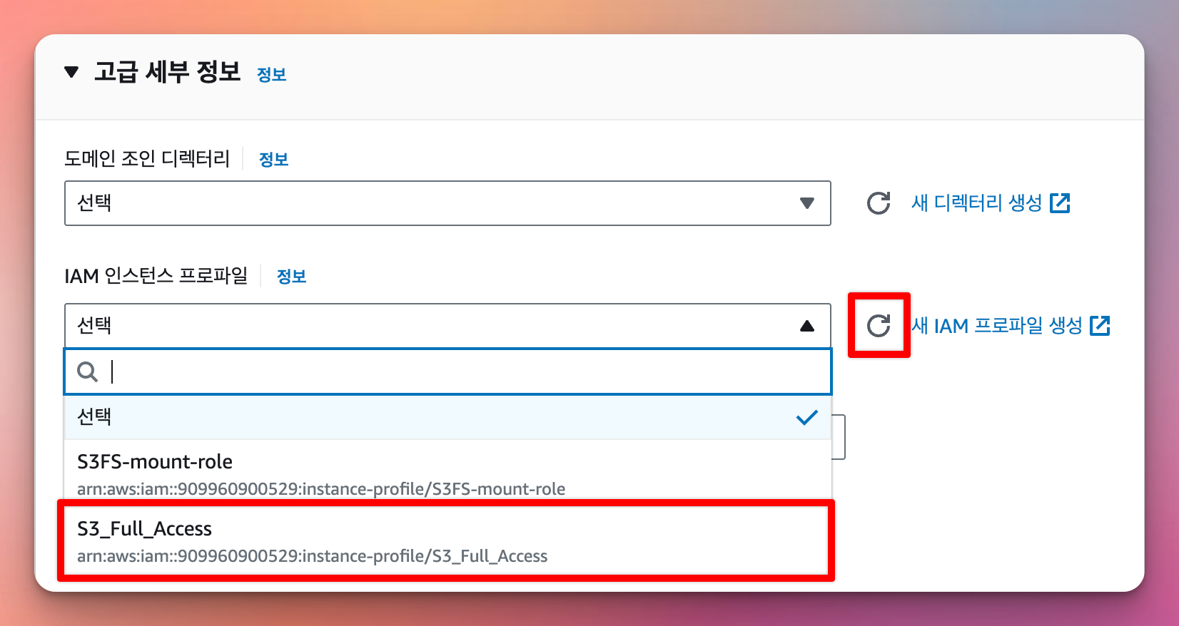 EC2 인스턴스 설정으로 돌아와서 > IAM 인스턴스 프로파일 새로고침 > 생성한 IAM 프로파일 선택