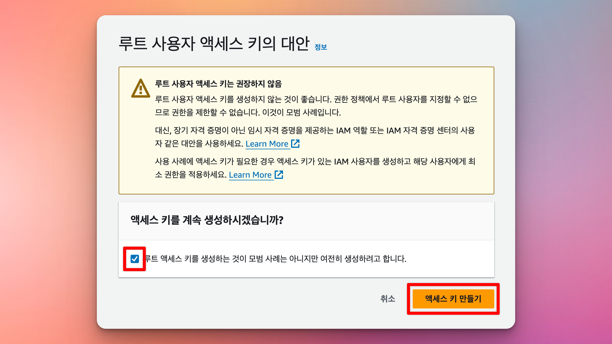 루트 액세스 키를 생성하는 것이 모범 사례는 아니지만 여전히 생성하려고 합니다.체크액세스 키 만들기클릭