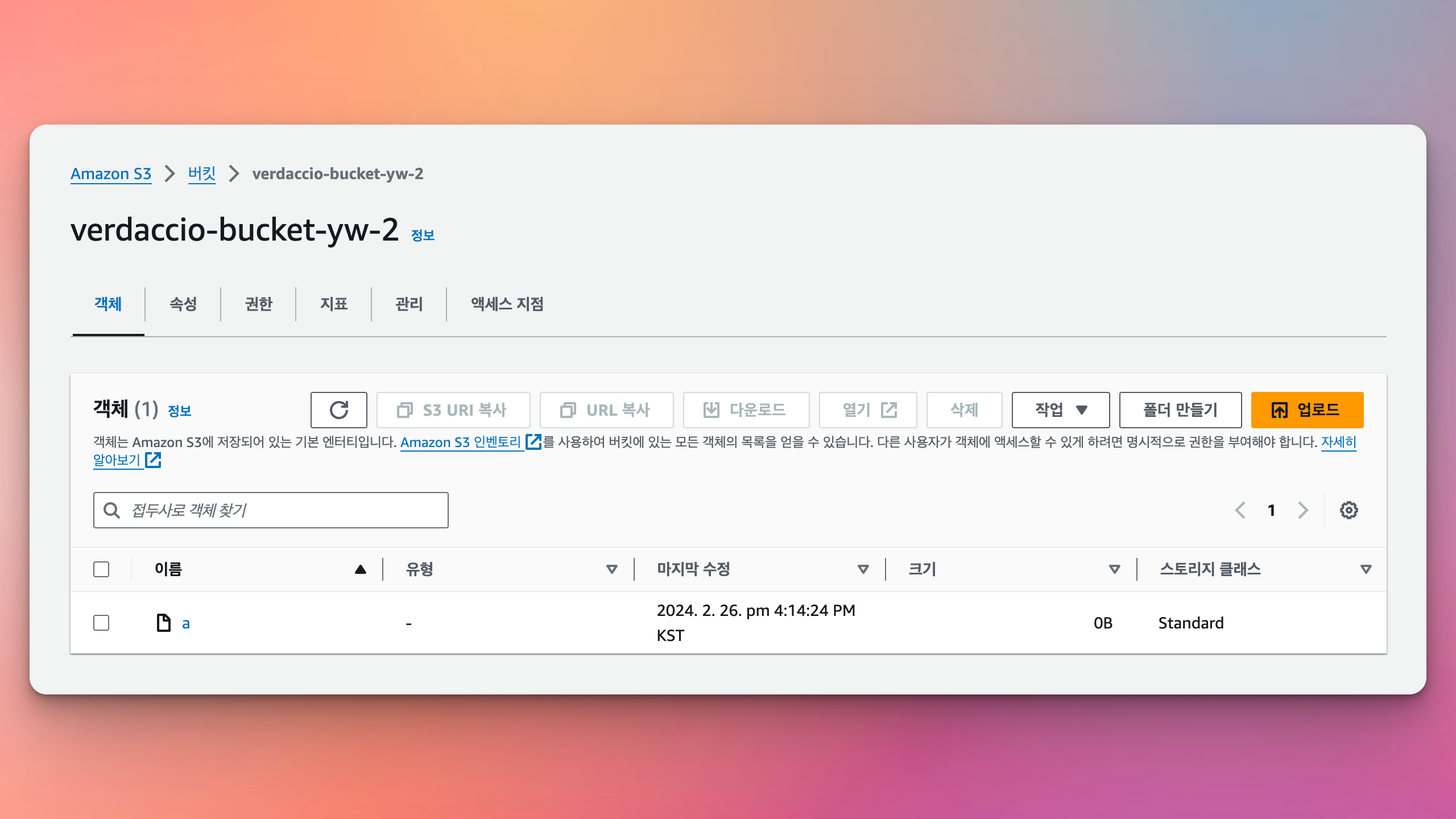 아래 명령으로 파일을 생성하고, 버킷에 제대로 업로드 되었는지 확인