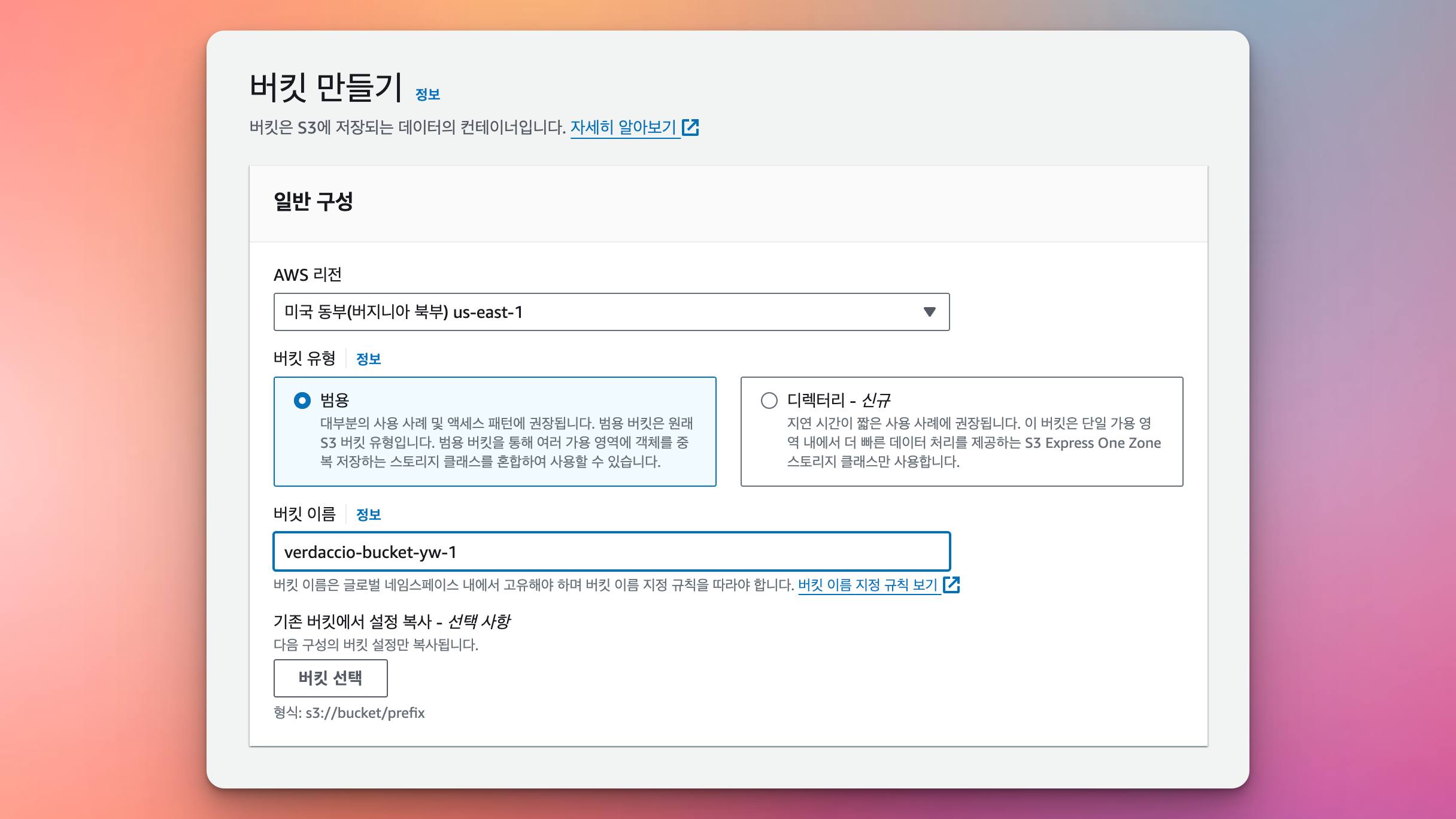 버킷 이름 : verdaccio-bucket-yw-1 (임의로 지정, 전 세계적으로 고유한 이름이어야 함)