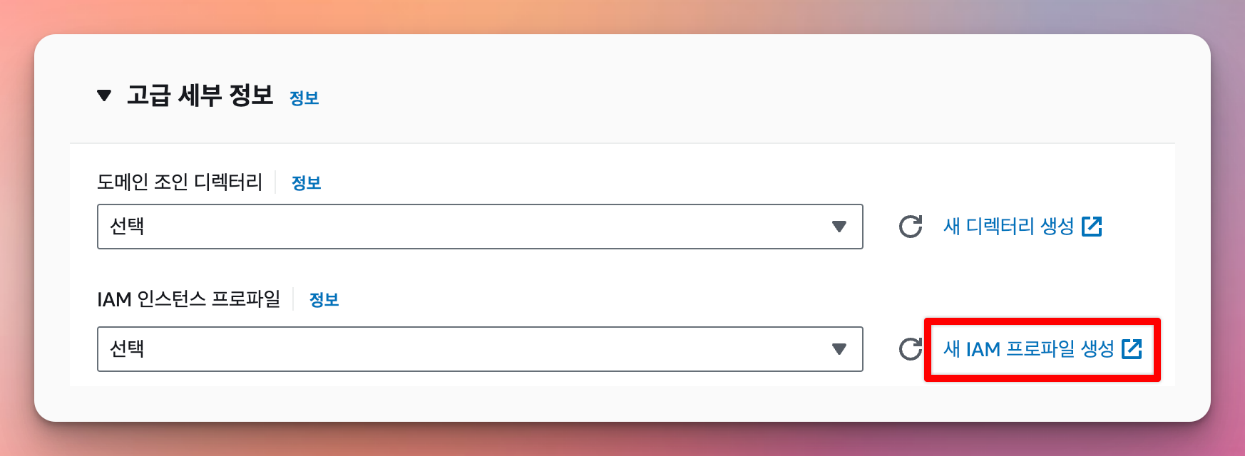 고급 세부 정보 > IAM 인스턴스 프로파일 지정