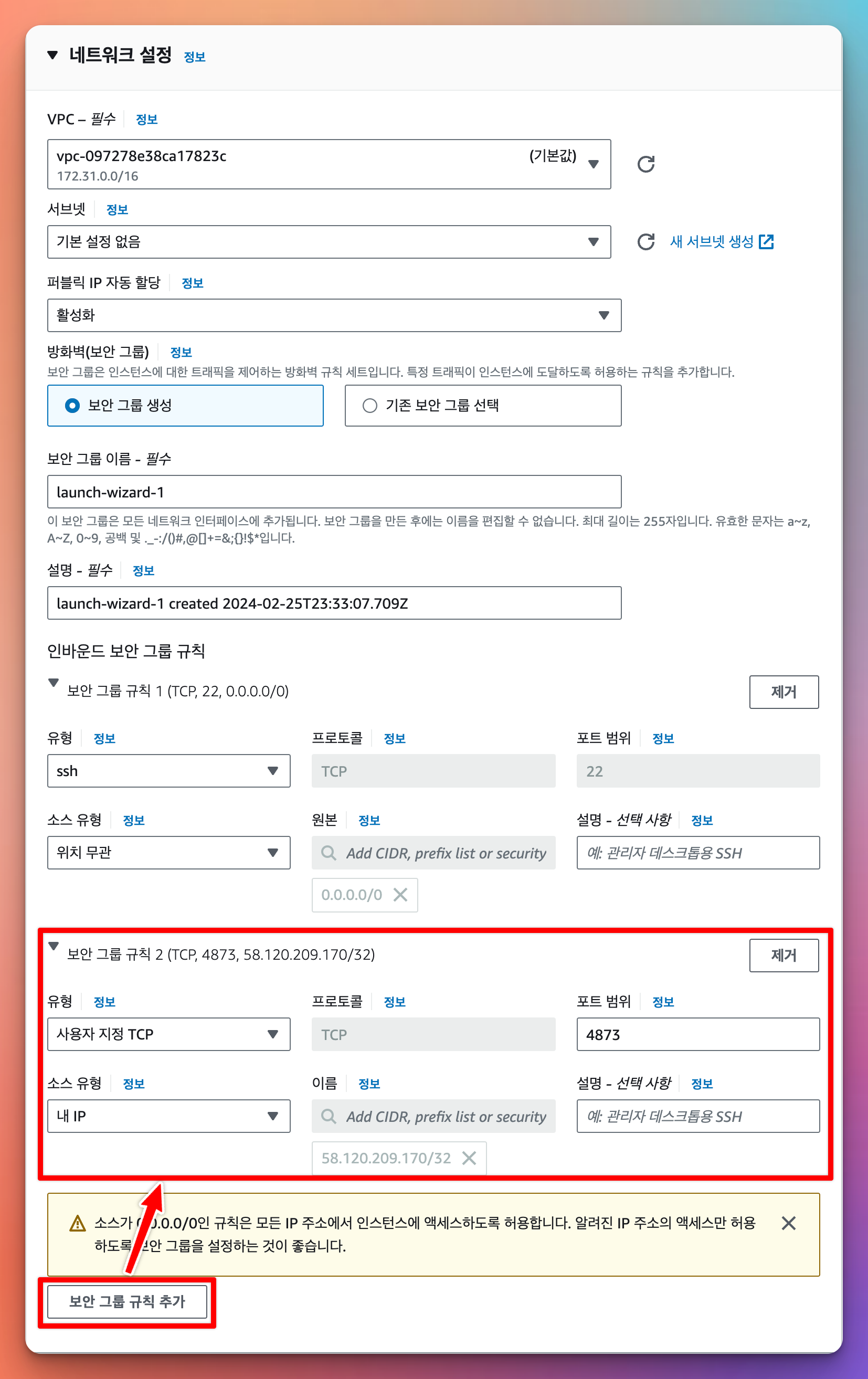 편집클릭 보안 그룹 규칙 추가클릭- 보안 그룹 규칙 설정