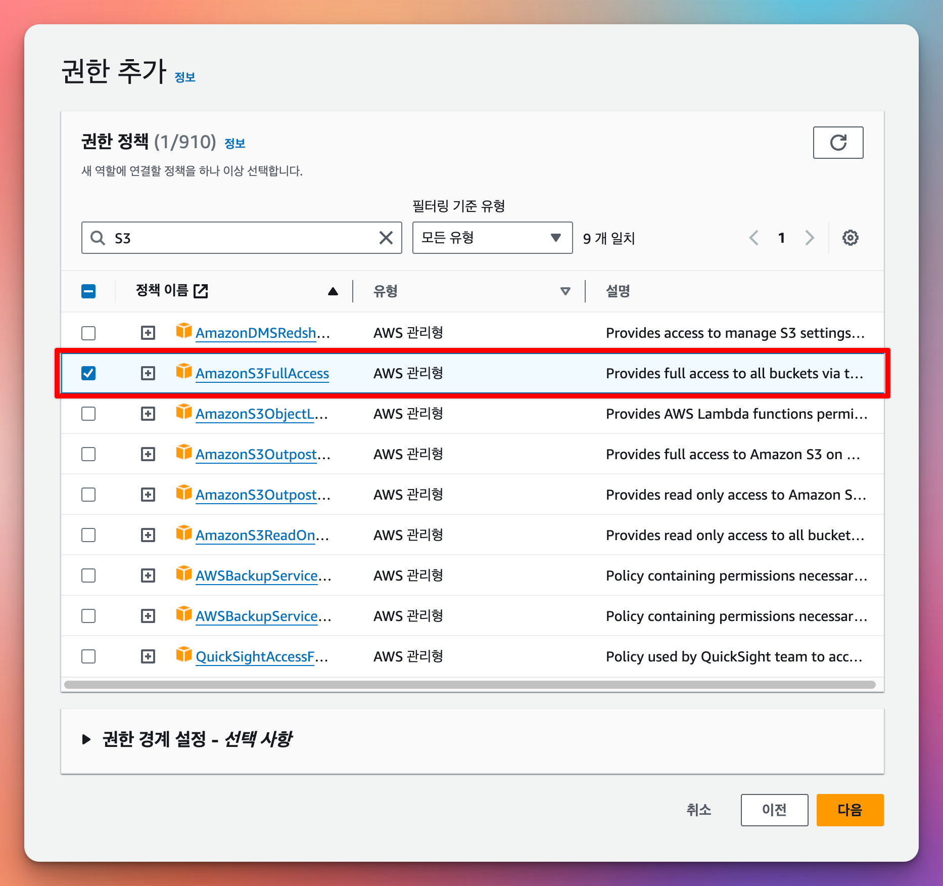 AmazonS3FullAccess 선택 > 다음 클릭
