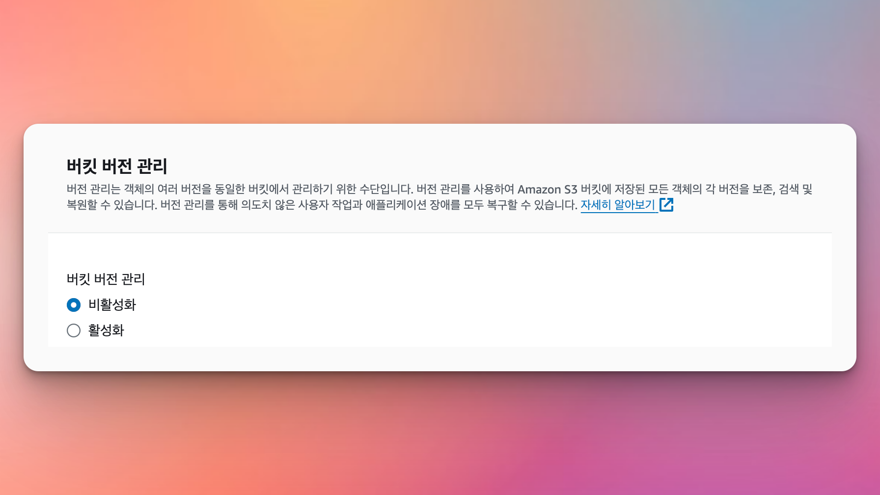 비활성화 (활성화 시 버전 각각에 대한 스토리지 비용 추가 청구됨)