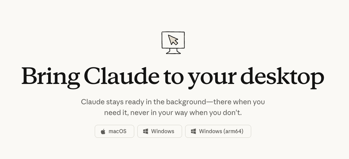 Claude Desktop 설치 프로그램은 Anthropic 공식 웹사이트에서 다운로드할 수 있습니다. macOS와 Windows 버전이 제공됩니다.